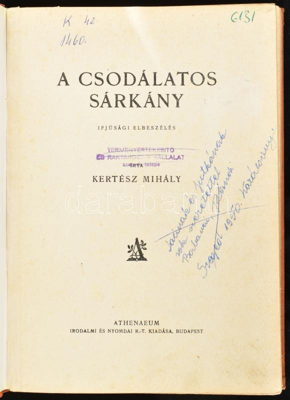 Kertész Mihály: A csodálatos sárkány. Ifjúsági elbeszélés. Bp., [1929], Athenaeum, 116+(4) p. Kiadói festett, illusztrált egészvászon-kötés, kissé kopottas, foltos borítóval, helyenként kissé foltos lapokkal, egy lap kissé sérült, a címlapon ajándékozási bejegyzéssel, intézményi bélyegzővel.