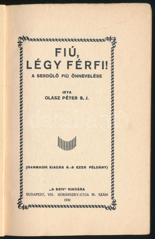 Olasz Péter S. J.: Fiú, légy férfi! A serdülő fiú önnevelése. Bp., 193... https://www.darabanth.com/en/457-Online-auction/457.0/Books/Books-Tales~1500035/Olasz-Peter-S-J-Fiu-legy-ferfi-A-serdulo-fiu-onnevelese-Bp-1930-A-Sziv-Apostol-~II3009836