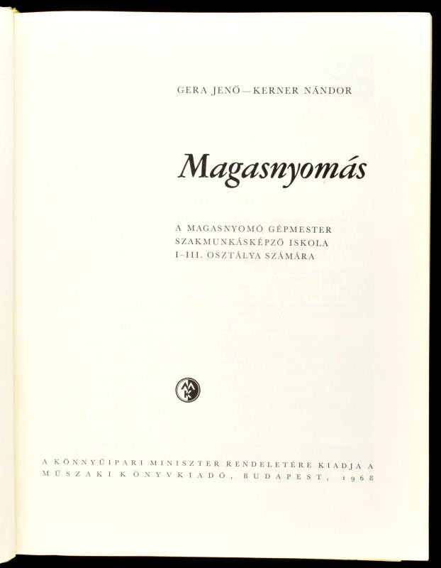 Gera Jenő - Kerner Nándor: Magasnyomás. A magasnyomó gépmester szakmun... https://www.darabanth.com/en/457-Online-auction/457.0/Books/Books-Technics~1500029/Gera-Jeno-Kerner-Nandor-Magasnyomas-A-magasnyomo-gepmester-szakmunkaskepzo-iskola-I-III~II2984482