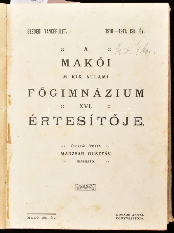 A Makói M. Kir. Állami Főgimnázium XVI-XXIII. értesítője, 1911-1918. (8 db egy kötetben). Összeáll.: Madzsar Gusztáv igazgató. Makó, 1911-1918, Kovács Antal-ny. Félvászon-kötésben, márványozott lapélekkel, helyenként kissé foltos lapokkal. Benne az iskola tanulói között Páger Antal (1899-1986) Kossuth-díjas színész nevének többszöri feltüntetésével (Makón született, itt járt iskolába), I. Ferenc József gyászjelentésével, stb.