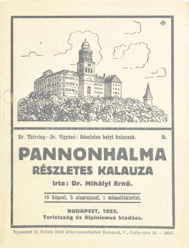 Dr. Mihályi Ernő: Pannonhalma részletes kalauza. Részletes helyi kalauzok 2. Bp., 1923, Turistaság és Alpinizmus, 1 t. + 36 p. Fekete-fehér képekkel illusztrált. Kiadói papírkötés.