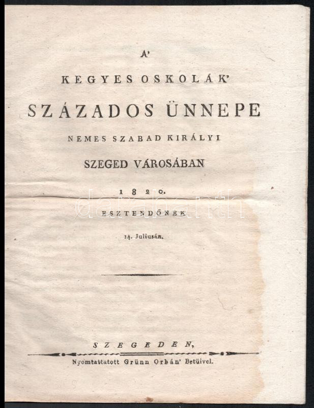 Description: [Katona Mihály Dénes (1782-1874)]: A' kegyes oskolák' százados ünnepe nemes szabad királyi Szeged városában 1820. esztendőnek 14. Juliusán. Szegeden, 1820, Grünn Orbán-ny., 8 p. Korabeli papírkötésben, hajtásnyommal, foltokkal, a 3-6. oldalak kijárnak.