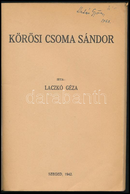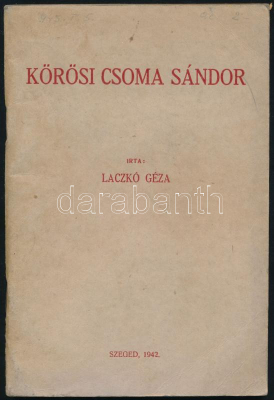 Laczkó Géza: Körösi Csoma Sándor. Szeged, 1942, (Városi Nyomda), 72 p. Kiadói tűzött papírkötés, tulajdonosi névbejegyzéssel.