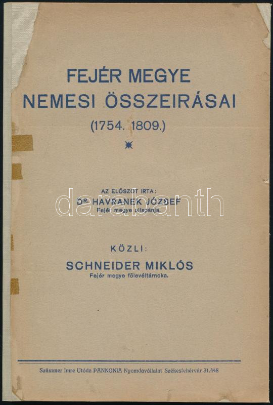 Description: Schneider Miklós: Fejér megye nemesi összeirásai (1754. 1809.) Dr. Havranek József előszavával. Székesfehérvár, 1934, szerzői kiadás (Számmer Imre Utóda Pannonia-ny.), 71 p. Papírkötésben, javított borítóval, belül jó állapotban.