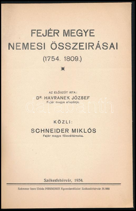 Schneider Miklós: Fejér megye nemesi összeirásai (1754. 1809.) Dr. Hav... https://www.darabanth.com/en/457-Online-auction/457.0/Books/Books-Travelling-Local-History~1500017/Schneider-Miklos-Fejer-megye-nemesi-osszeirasai-1754-1809-Dr-Havranek-Jozsef-eloszavava~II3059522