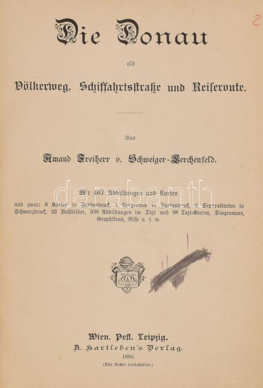 Schweiger-Lerchenfeld, Amand Frhr. v.: Die Donau als Völkerweg, Schiffahrtsstraße und Reiseroute. Bécs-Pest-Lipcse, 1896, A. Hartleben's. Későbbi aranyozott gerincű félvászon kötésben, márványozott lapélekkel.
