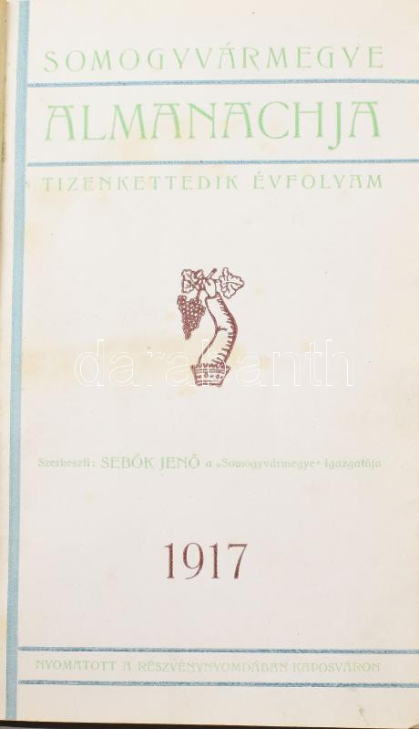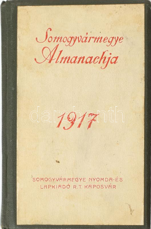 Somogyvármegye Almanachja 1917. Tizenkettedik évfolyam. Kaposvár, 1917... https://www.darabanth.com/en/457-Online-auction/457.0/Books/Books-Travelling-Local-History~1500017/Somogyvarmegye-Almanachja-1917-Tizenkettedik-evfolyam-Kaposvar-1917-Reszvenynyomda-4plus208-p~II3061562