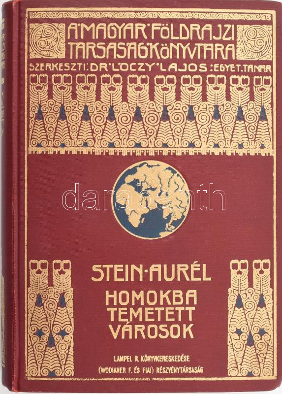 Stein Aurél (1862-1943): Homokba temetett városok. Régészeti és földrajzi utazás Indiából Kelet-Turkesztánba 1900-1901-ben. Lóczy Lajos előszavával. Fordította: Halász Gyula. Magyar Földrajzi Társaság Könyvtára. Bp.,én., Lampel R. (Wodianer F. és Fiai) Rt.,1 (címkép, Stein Aurél arcképe) t. + 267 p.+14 (fekete-fehér fotók) t. Egészoldalas fekete-fehér fotókkal illusztrált. Kiadói dúsan aranyozott egészvászon sorozatkötésben, a borítón kis kopásnyomokkal, térkép nélkül, de ezt leszámítva jó állapotban.