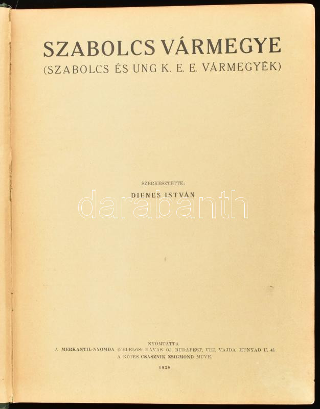 Szabolcs vármegye. (Szabolcs és Ung k. e. e. vármegyék.) Szerk.: Dienes István. I. rész.: A föld. II. rész.: A nép. III. rész: Községi adattár. IV. rész.: Személyi adattár. Vármegyei Szociográfiák. IV. köt. Szerk.: Csíkvári Antal. Főmunkatársak: Kertész János, Nyárády Mihály. Bp.,1939., Vármegyei Szociográfiák Kiadóhivatala,(Merkantil-ny.), 370 + 540 (háromhasábos számozás) p. Gazdag fekete-fehér szövegközti képanyaggal illusztrált. Kiadói aranyozott,festett egészvászon-kötésben, az elülső táblán a vármegye festett, dombornyomott címerével, kopott borítóval, a gerincén kis sérüléssel, kissé laza fűzéssel.