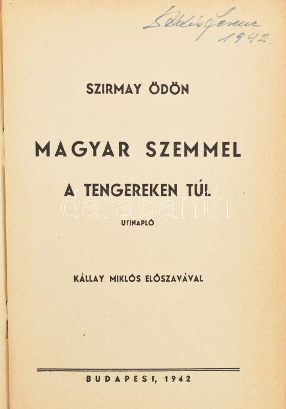 Szirmay Ödön: Magyar szemmel a tengereken túl. Utinapló. Kállay Miklós előszavával. Bp., 1942, (Bányai és Várkonyi-ny.), 228 p. Kiadói egészvászon-kötés, jó állapotban, tulajdonosi névbejegyzéssel.