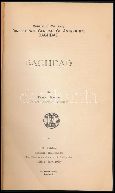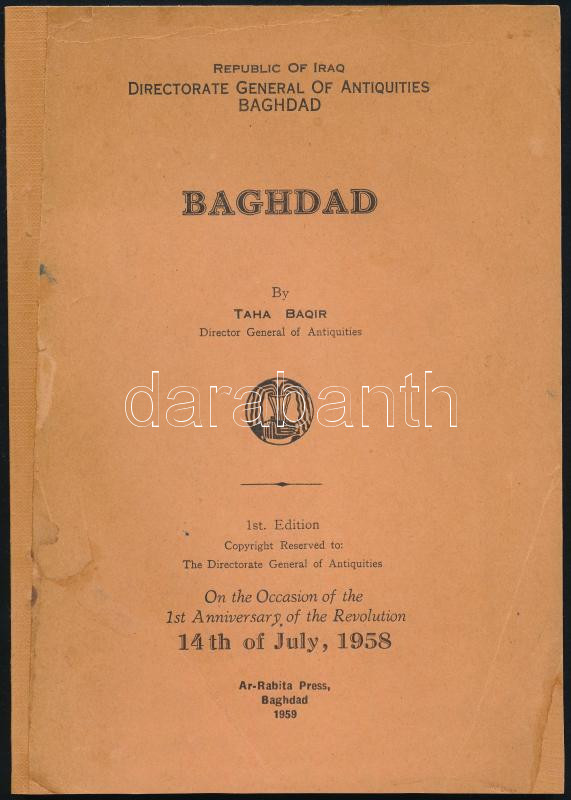 Taha Baqir: Baghdad. Baghdad, 1959, Directorate General of Antiquities (Ar-Rabita Press), 15+(1) p.+ 28 (fekete-fehér fotók) t. Első kiadás. Angol nyelven. Papírkötésben, sérült, javított borítóval, belül jó állapotban. / First edition. In English language. Paperbinding, with slightly damaged cover.