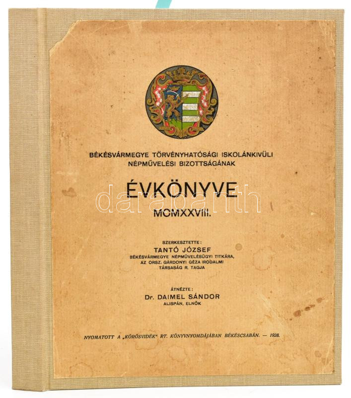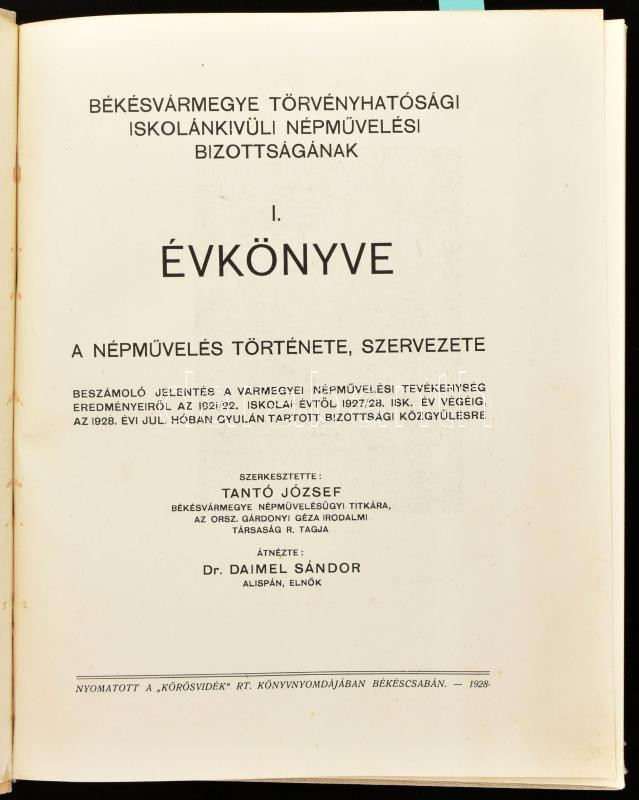 Tantó József (szerk.): Békésvármegye Törvényhatósági Iskolánkívüli Népművelési Bizottságának I. évkönyve. Békéscsaba, 1928, "Körösvidék" Rt. Könyvnyomdája. 191 p. + 1 t. (Békés vármegye külterületi elemi népiskoláinak térképe). Számozatlan példány. Fekete-fehér képekkel és táblázatokkal, egy színes ábrával rendkívül gazdagon illusztrált. Modern átkötött egészvászon kötésben, az eredeti sérült papírborítót a modern borítóra ragasztva, néhány kevés lap széle szöveget és képeket nem érintő kisebb sérülésekkel, néhány lap széle kissé foltos. Mellékelve egy levél a könyv küldéséról a nagyszénási ev. lelkészi hivatalnak, a szerkesztő, Tantó József (1888-1973) író, néprajzkutató és Szentkereszty Tivadar (1871-1959) Békés vármegyei királyi tanfelügyelő, Békésvármegye Törvényhatósági Iskolánkívüli Népművelési Bizottságának ügyvezető elnökének autográf aláírásaival és a bizottság bélyegzőjével.