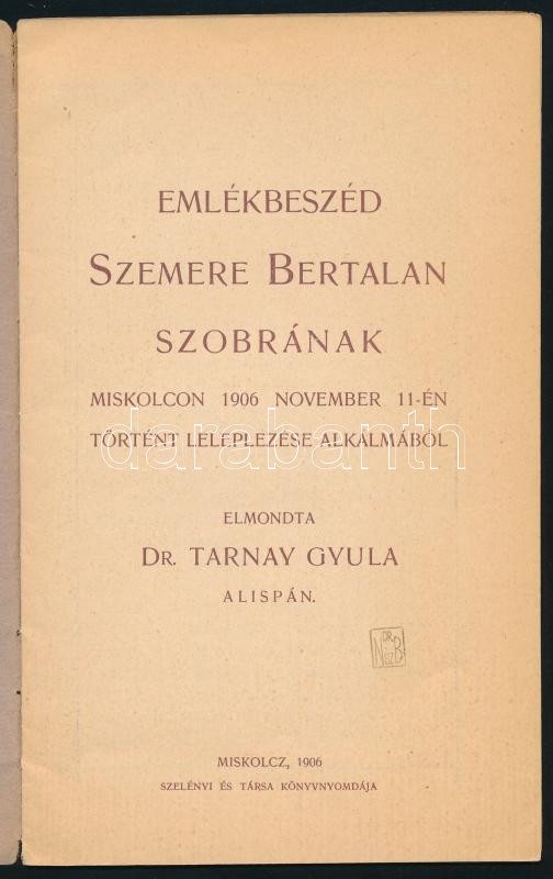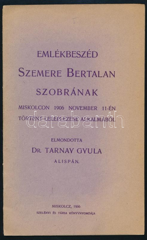 https://www.darabanth.com/en/457-Online-auction/457.0/Books/Books-Travelling-Local-History~1500017/Tarnay-Gyula-Emlekbeszed-Szemere-Bertalan-szobranak-leleplezese-alkalmabol-Miskolc-1906-Sz~II3006515