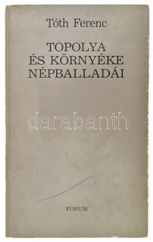 Tóth Ferenc: Topolya és környéke népballadái. Újvidék, 1981, Forum. Kiadói papírkötés, tulajdonosi bejegyzéssel, a borítón tollnyommal és kopásnyomokkal. Megjelent 2000 példányban.