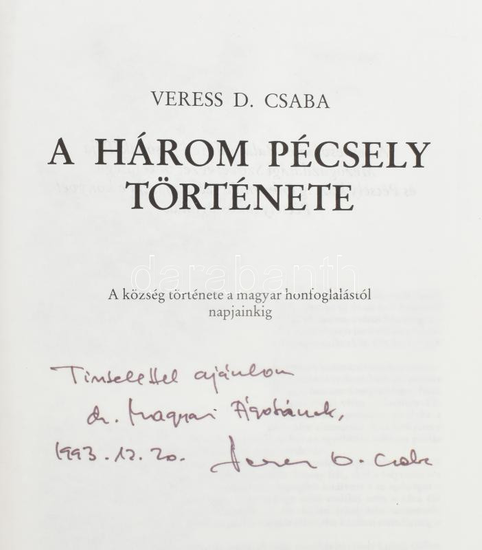 Veress D. Csaba: A három Pécsely története. A község története a magyar honfoglalástól napjainkig. (DEDIKÁLT). Veszprém Megyei Levéltár kiadványa 9. Veszprém, 1993, Veszprém Megyei Levéltár. Kiadói kartonált papírkötés. Megjelent 2000 példányban. A szerző, Veress D. Csaba (1933-2014) történész, helytörténész által DEDIKÁLT példány.