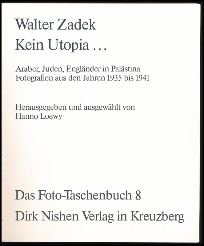 Description: Walter Zadek: Kein Utopia... Araber, Juden, Engländer in Palästina. Fotografien aus den Jahren 1935 bis 1941. Das Foto-Taschenbuch 8. Kreuzberg, 1986, Dirk Nishen Verlag. Fekete-fehér fotókkal illusztrálva. Német nyelven. Kiadói papírkötés, jó állapotban.