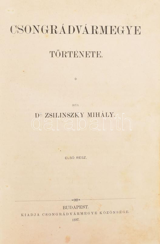 Zsilinszky Mihály: Csongrádvármegye története I. rész. Bp., 1897 Csongrádvármegye Közönsége, (Wodianer-ny.) 1t litografált címer + 287 p. korabeli sérült vászonkötésben, laza fűzéssel