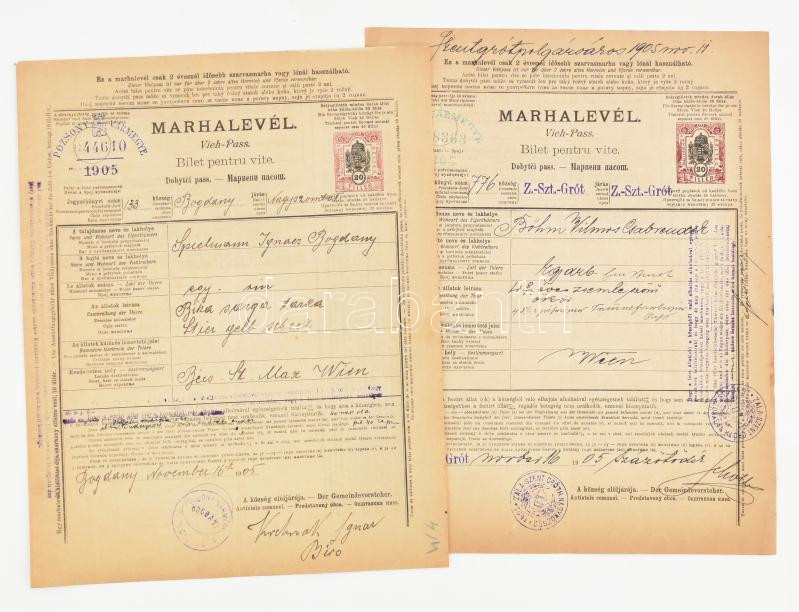 https://www.darabanth.com/en/457-Online-auction/457.0/Hungarian-philately-and-postal-history/Document-Stamps~500024/1905-2-db-marhalevel-kulonbozo-vizjelekkel~II3061797