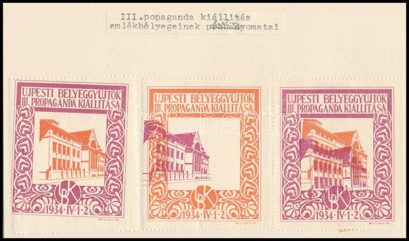 1934 3 db Újpesti Bélyeggyűjtők III. propaganda kiállítása levélzáró elcsúszott középrésszel (2 db papírlapra felragasztva / 2 label glued on paper)