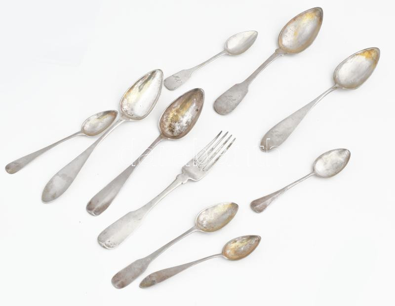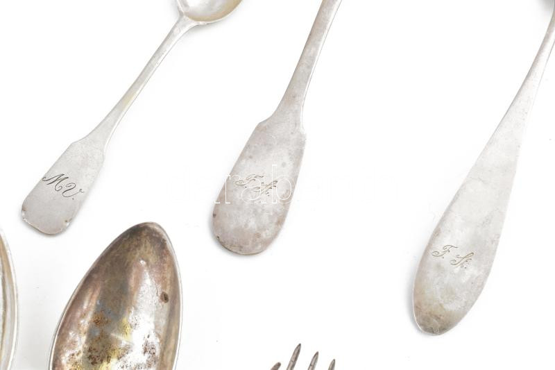 Antik ezüst (Ag) kiskanalak, nagykanalak, villa, 13 latos tisztaságjellel, klf mestejegyekkel, össz 296g