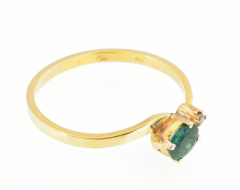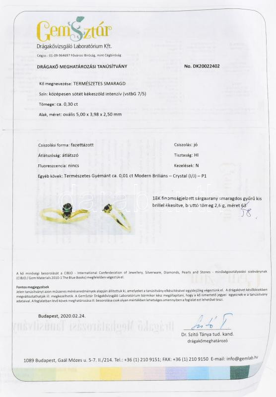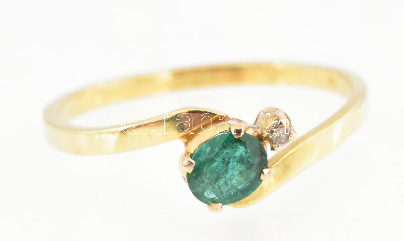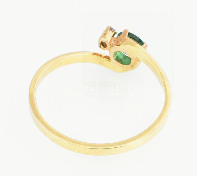 Arany (Au) 18K gyűrű természetes smaragddal, 0,3 ct, gyémánttal, ca. 0,01 ct, modern briliáns, jelzett, tanúsítvánnyal, méret: 58, bruttó: 2,6 g