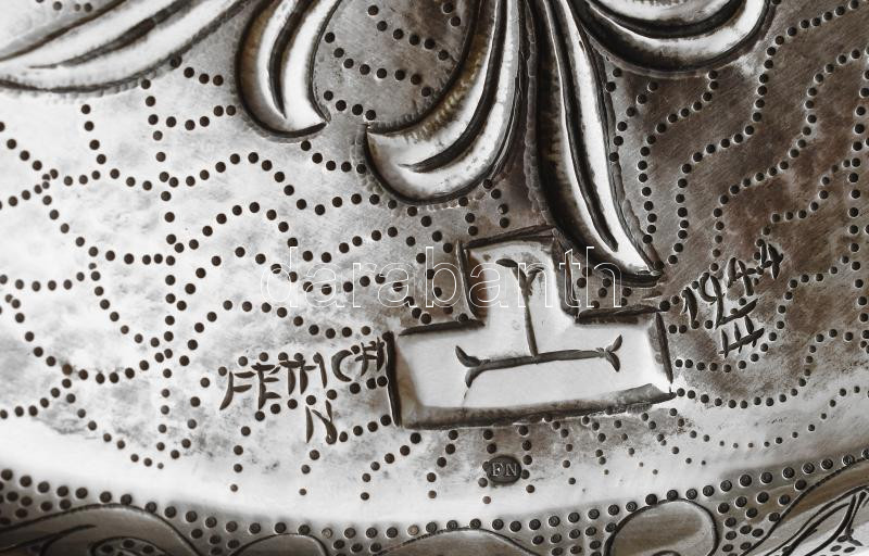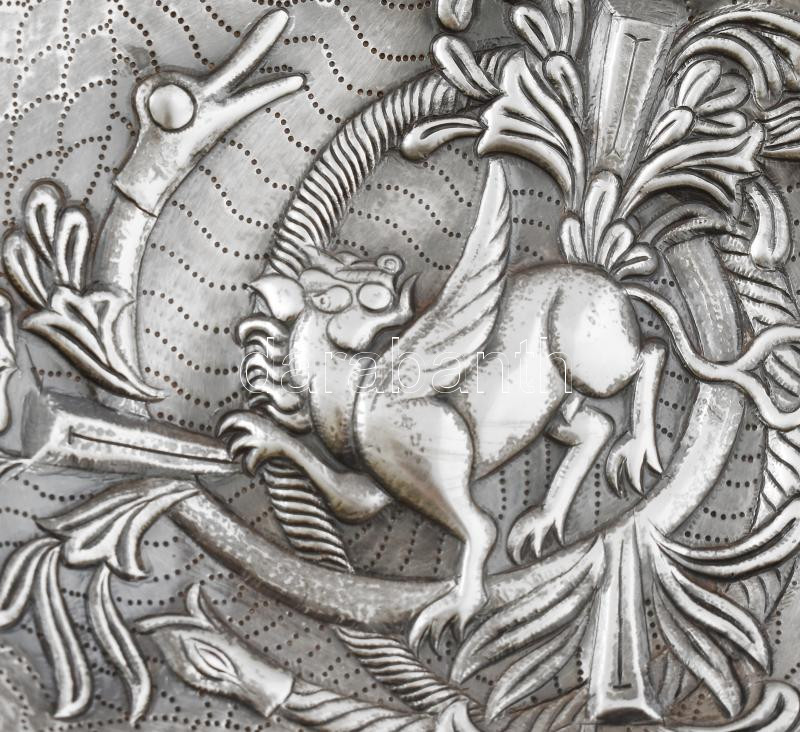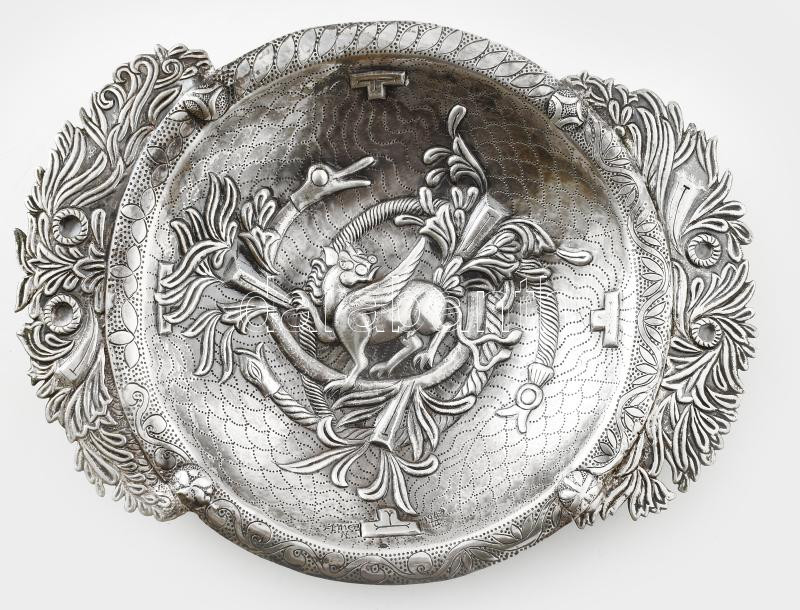 Description: Dr. Fettich Nándor (1900-1971): Honfoglalás kori ezüst (Ag.) szasszanida áldozati tál másolata, griff díszítéssel poncolt, kalapált, jelzett, 580 g, 30x22 cm Reprodulálva: Fettich Nándor: Magyar stílus az iparművészetben. Bp., 1947. MNM. / Silver sassanida bowl with gryphon decor modern artist replica made by a famous Hungarian archeologist