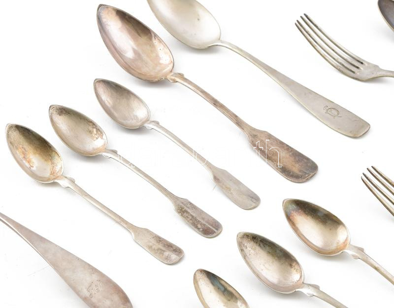 Ezüst (Ag) evőeszközök tételben, nem komplett készletek, kiskanalak, nagykanalak, villák, jelzettek, össz nettó 851 g