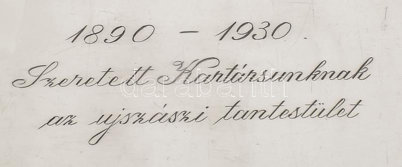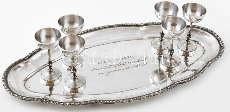Ezüst (Ag) tálca, 6 db pohárral, jelzett, gravírozott felirattal, 40×2...
