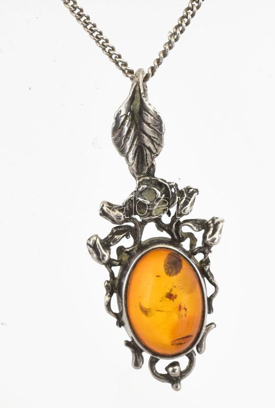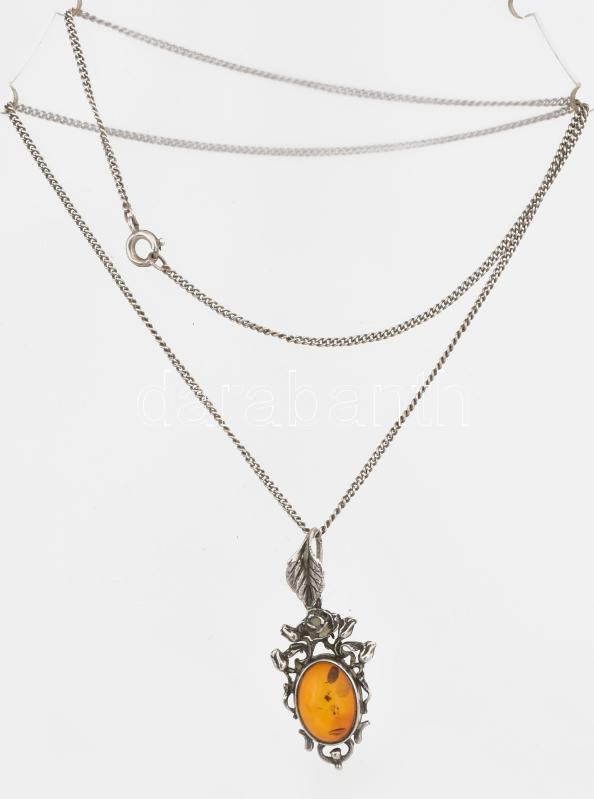 Ezüst(Ag) nyaklánc borostyán medállal, jelzett, h: 48 cm, bruttó: 5,9 ...
