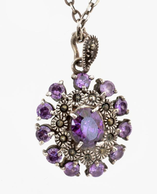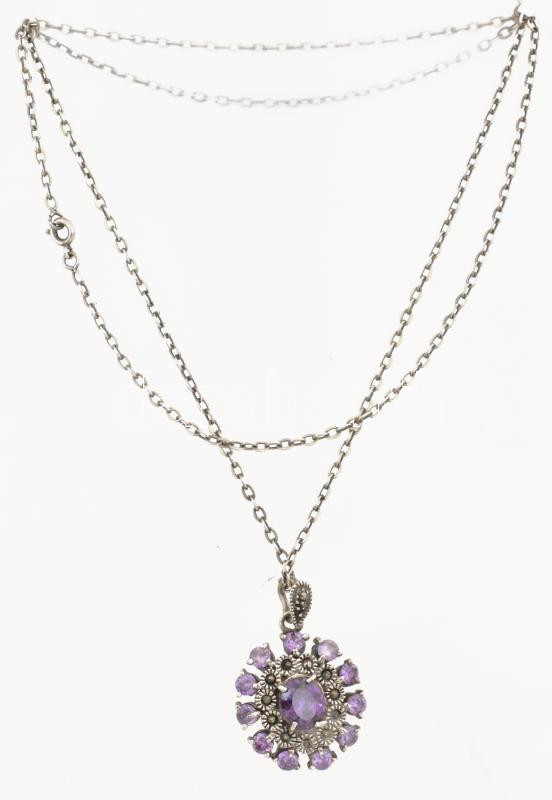Ezüst(Ag) nyaklánc lila köves medállal, jelzett, h: 64 cm, bruttó: 14,5 g
