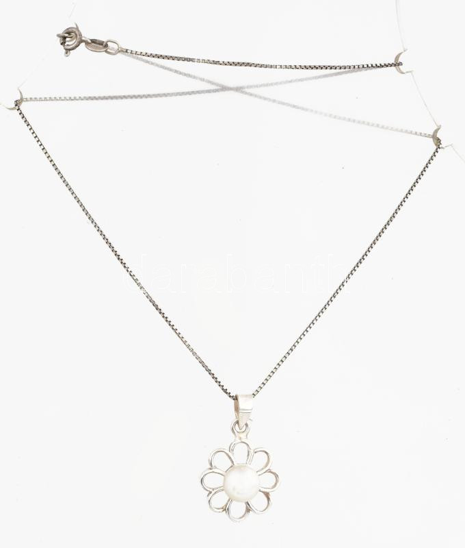 Ezüst(Ag) venezianer nyaklánc gyöngyös virágos medállal, jelzett, h: 40 cm, bruttó: 4,2 g