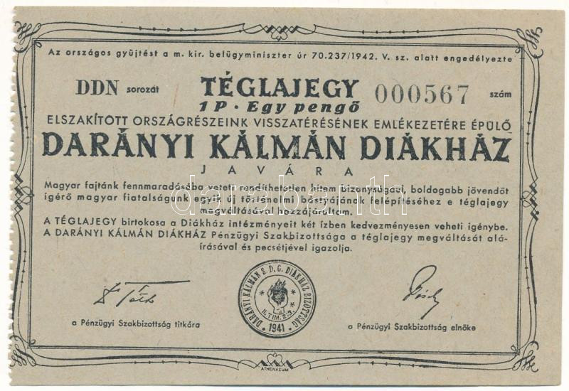 ~1940. "Darányi Kálmán Diákház" téglajegy 1P értékben T:XF
