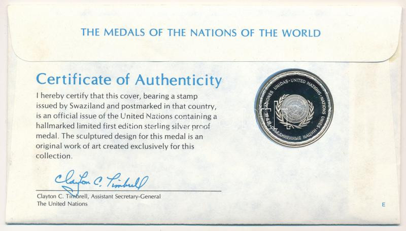ENSZ 1980. "A Világ nemzeteinek emlékérmei - Szváziföld" Ag emlékérem megcímzett érmés borítékon elsőnapi bélyegzős bélyeggel, hátoldali tanúsítvánnyal, ismertetővel (~12g/0.925/32mm) T:PP