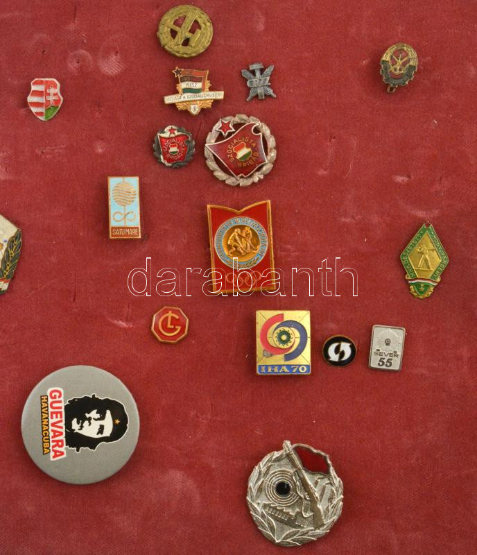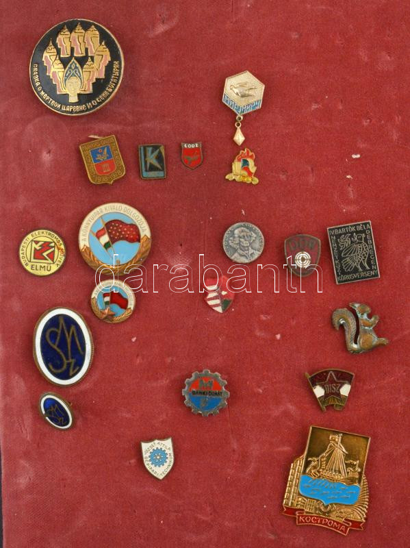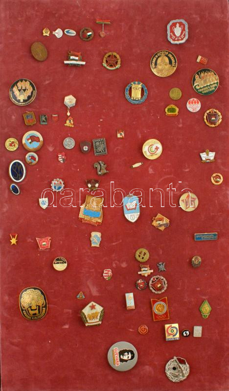 69db-os magyar és külföldi jelvénytétel zománcozott darabokkal, közte iskolajelvények, Kossuth-címer, Olimpia, Magyar-Szovjet Baráti Társaság, József Attila Olvasómozgalom, Díszszemle 1961, Könnyűipar Kiváló Dolgozója, ELMŰ, DISZ, Kiváló Kisdobos Munkáért, stb. + 34x58cm méretű tálca T:vegyes