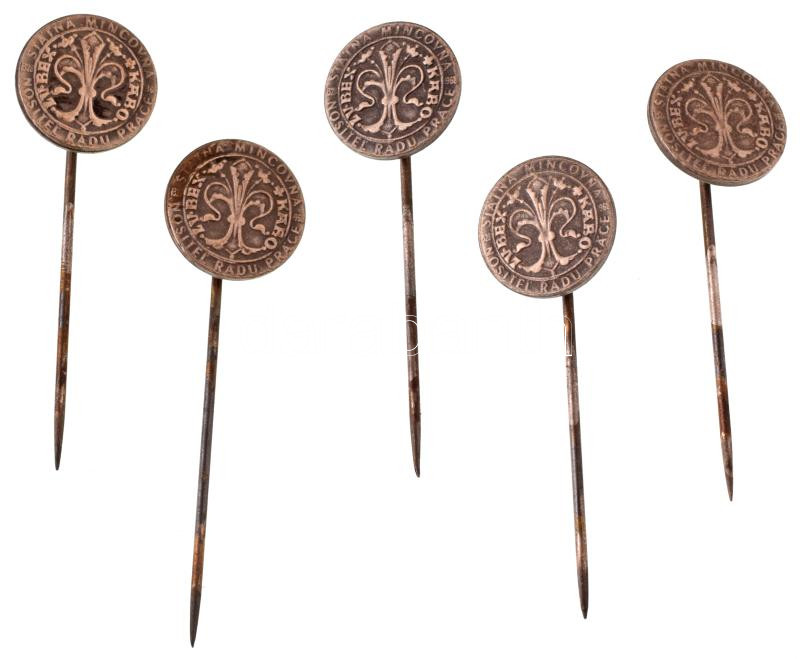 Description: Csehszlovákia 1968. "Állami Pénzverde - a Munkaügyi Tanács tagja" Károly Róbert aranyforintját ábrázoló ezüstpatinázott bronz jelvény (5db) T:UNC,AU