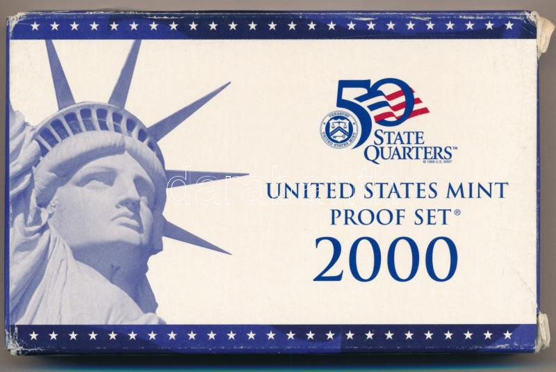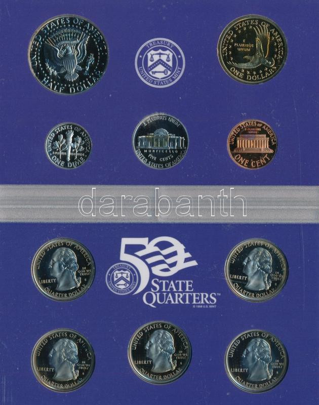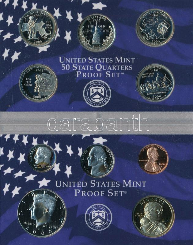 Description: Amerikai Egyesült Államok 2000S 1c-1$ (6xklf) forgalmi sor, műanyag tokban + 1/4$ Cu-Ni "50 állam" (5xklf), műanyag tokban, közös tanúsítvánnyal, karton dísztokban T:PP fo.