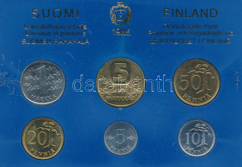 https://www.darabanth.com/en/457-Online-auction/457.0/Numismatics/Foreign-Coin-sets~17/Finnorszag-1985-5p-5M-6xklf-forgalmi-sor-plasztik-tokban-TUNC-Finland-1985-5-Pennia-5-Markk~II3034299