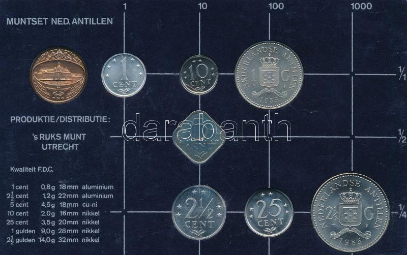 Holland Antillák 1985. 1c - 2 1/2G (7xklf) forgalmi sor + "Rijks ... https://www.darabanth.com/en/457-Online-auction/457.0/Numismatics/Foreign-Coin-sets~17/Holland-Antillak-1985-1c-2-12G-7xklf-forgalmi-sor-plus-Rijks-Munt-Cu-zseton-muanyag-disztokb~II3034289