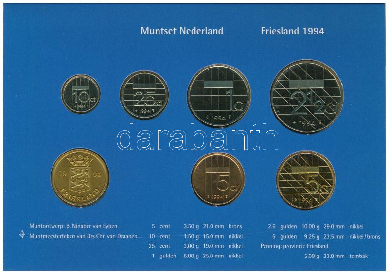 Hollandia 1994. 5c-2 1/2G (6xklf) forgalmi sor karton tokban, pénzverd... https://www.darabanth.com/en/457-Online-auction/457.0/Numismatics/Foreign-Coin-sets~17/Hollandia-1994-5c-2-12G-6xklf-forgalmi-sor-karton-tokban-penzverdei-zsetonnal-TPP-Netherland~II2963161