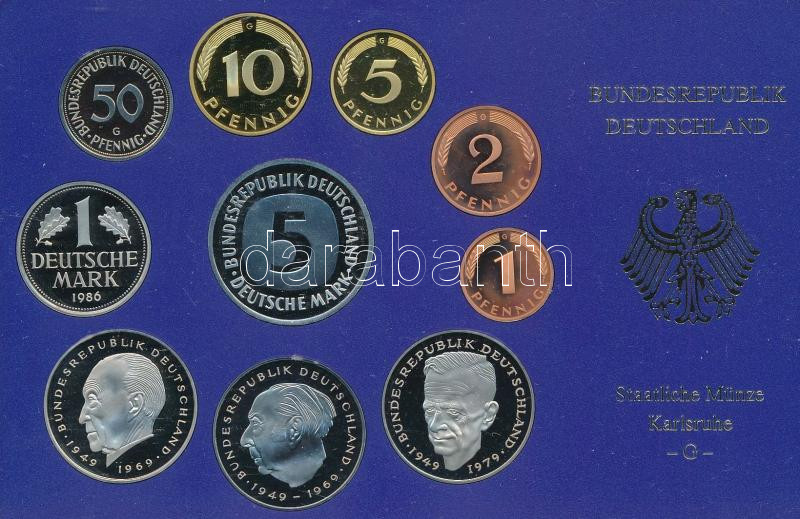 https://www.darabanth.com/en/457-Online-auction/457.0/Numismatics/Foreign-Coin-sets~17/NSZK-1986G-1pf-5M-10xklf-forgalmi-sor-muanyag-disztokban-TPP-FRG-1986G-1-Pfennig-5-Mark-10xd~II3033793