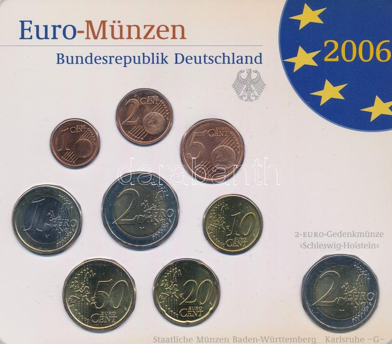 Németország 2006G 1c-2E (8xklf) + 2E "Schleswig-Holstein" fo... https://www.darabanth.com/en/457-Online-auction/457.0/Numismatics/Foreign-Coin-sets~17/Nemetorszag-2006G-1c-2E-8xklf-plus-2E-Schleswig-Holstein-forgalmi-szett-muanyag-tokban-TUNC-Ge~II3033867