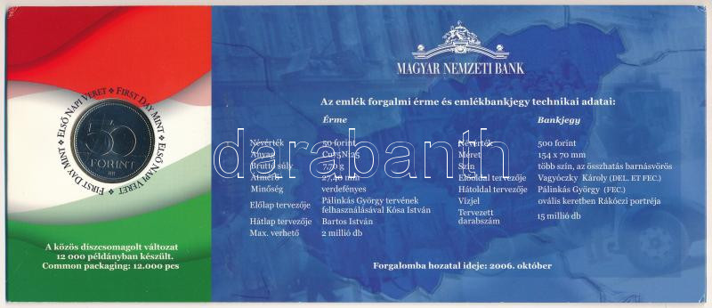 2006. 50Ft Cu-Ni "1956-os forradalom" első napi veret + 500Ft "1956-os forradalom", "EB 0007852" közös díszcsomagolásban T:UNC,UNC a csomagolás egyik sarka kissé benyomódott