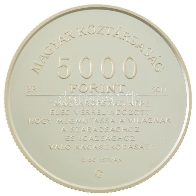 https://www.darabanth.com/en/457-Online-auction/457.0/Numismatics/Hungarian-coins-and-coins-with-Hungarian-mint-marks~9/2011-5000Ft-Ag-Bibo-Istvan-szuletesenek-100-evforduloja-kapszulaban-tanusitvannyal-T~II2995542