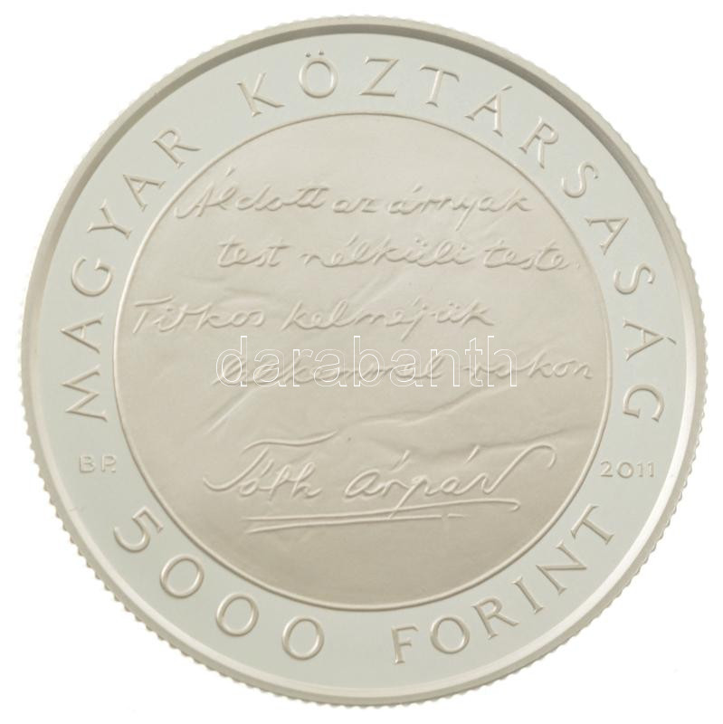 https://www.darabanth.com/en/457-Online-auction/457.0/Numismatics/Hungarian-coins-and-coins-with-Hungarian-mint-marks~9/2011-5000Ft-Ag-Toth-Arpad-szuletesenek-125-evforduloja-kapszulaban-tanusitvannyal-T~II2995534