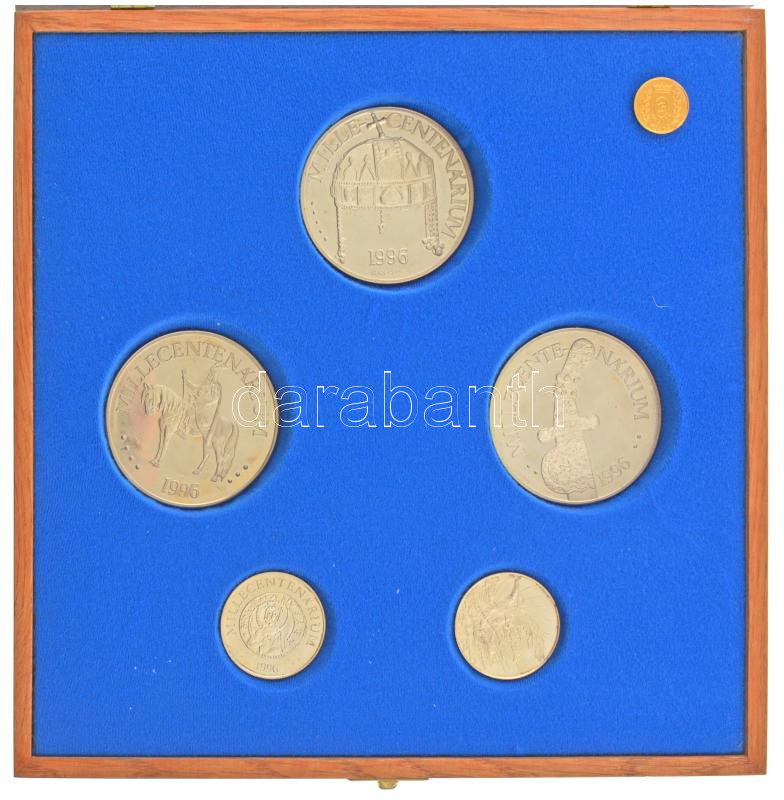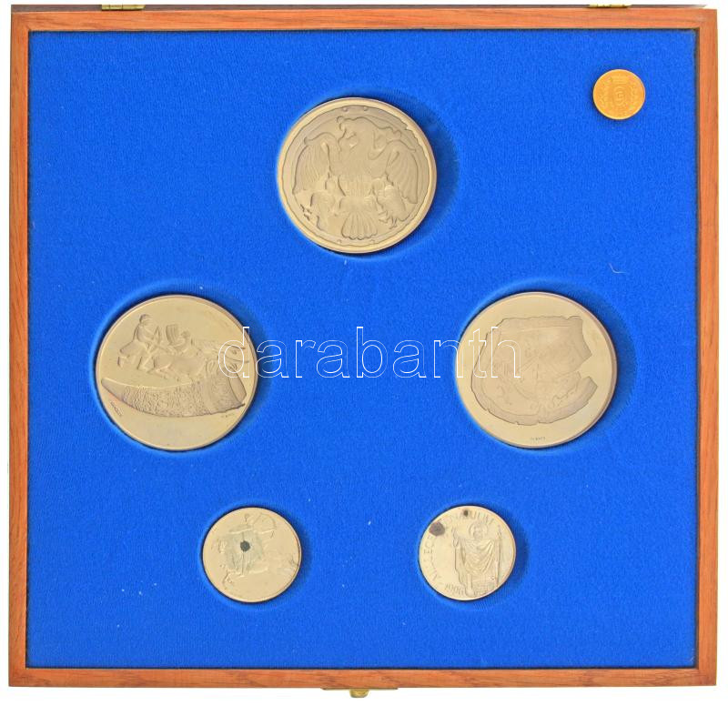 Csóka Zsuzsanna (1962-) 1996. "Millecentenárium" Ag emlékérem sorozat fa dísztokban a Babits Kiadótól a következő felosztásban: "Árpád fejedelem / Csodaszarvas és Lehel kürtje" + "Szent Korona / Rakamazi Korong" + "Attila kardja / Tarsoly" (3x~93,80g/0.925) + "Szent István pénze / Lovasíjász" + "Szent István szobor / Turul" (2x~15,6g/0.925) T:AU (PP) oxidáció, fo.