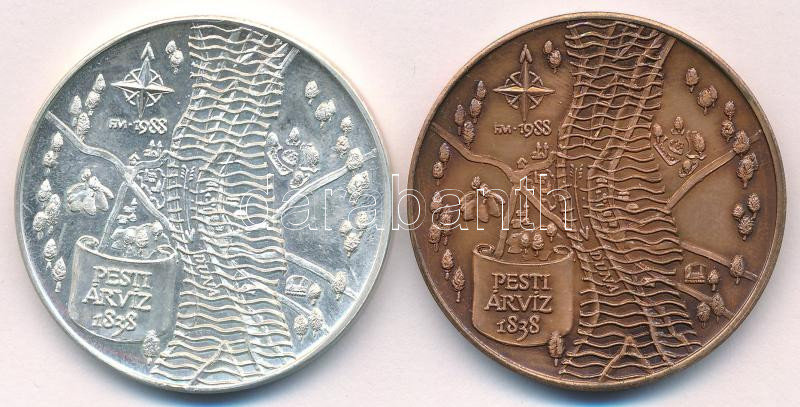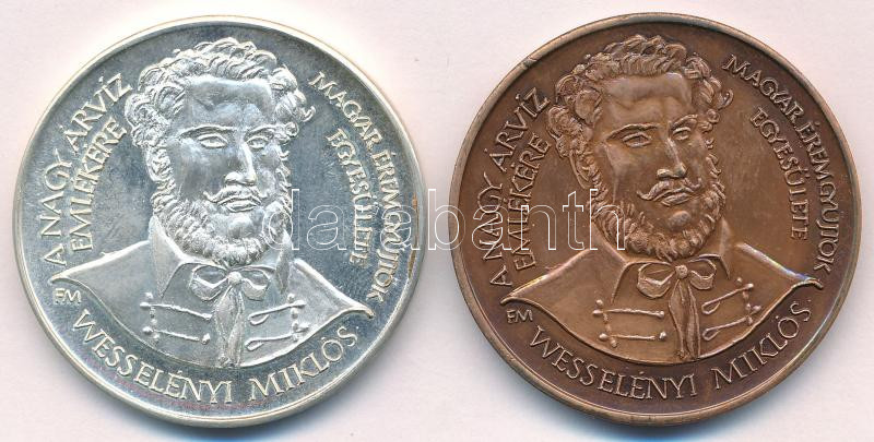 Description: Fritz Mihály (1947-) 1988. "MÉE - A nagy árvíz emlékére - Wesselényi Miklós / Pesti árvíz 1838" jelzett Ag és bronz emlékérem pár (36,33g/0.835/42,5mm) T:UNC,AU (eredetileg PP)