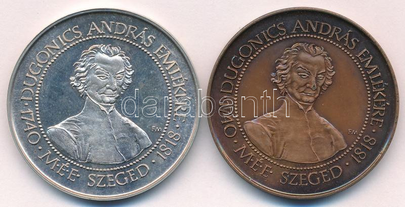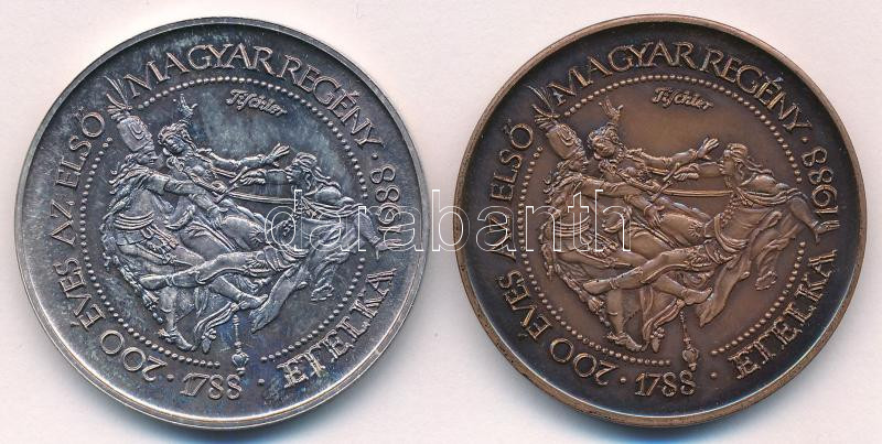 Description: Fritz Mihály (1947-) 1988. "MÉE - Dugonics András / 200 éves az első magyar regény - Etelka" jelzett Ag és bronz emlékérem pár (36,43g/0.835/42,5mm) T:UNC,AU (eredetileg PP)