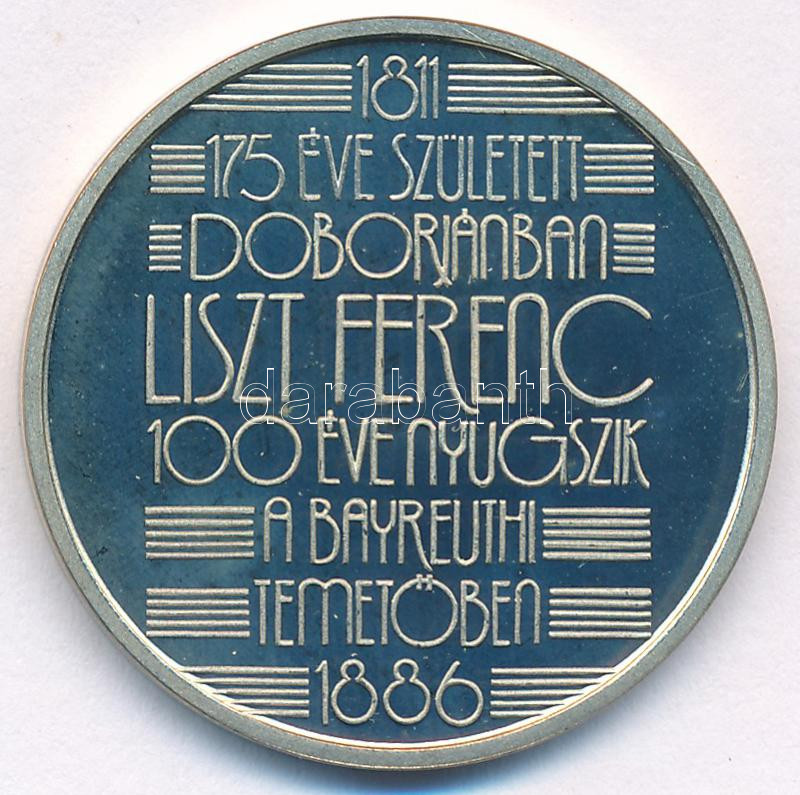 Fülöp Zoltán (1951-) 1986. "175 éve született Doborjánban Liszt F... https://www.darabanth.com/en/457-Online-auction/457.0/Numismatics/Hungarian-commemorative-medals-and-plaques~11/Fulop-Zoltan-1951-1986-175-eve-szuletett-Doborjanban-Liszt-Ferenc-100-eve-nyugszik-a-B~II2853054
