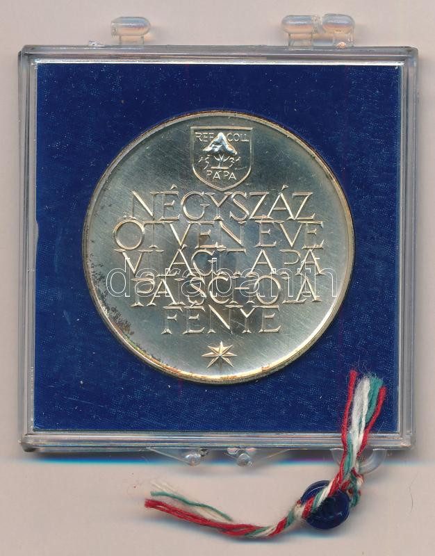 Description: Rékassy Levente (1943-) / Vadász György (1924-1997) 1981. "450 éves a Pápai Református Kollégium" jelzett Ag emlékérem sérült, plombált, sérült műanyag "ÁPV" (35,08g/0.640/42mm) T:BU patina
