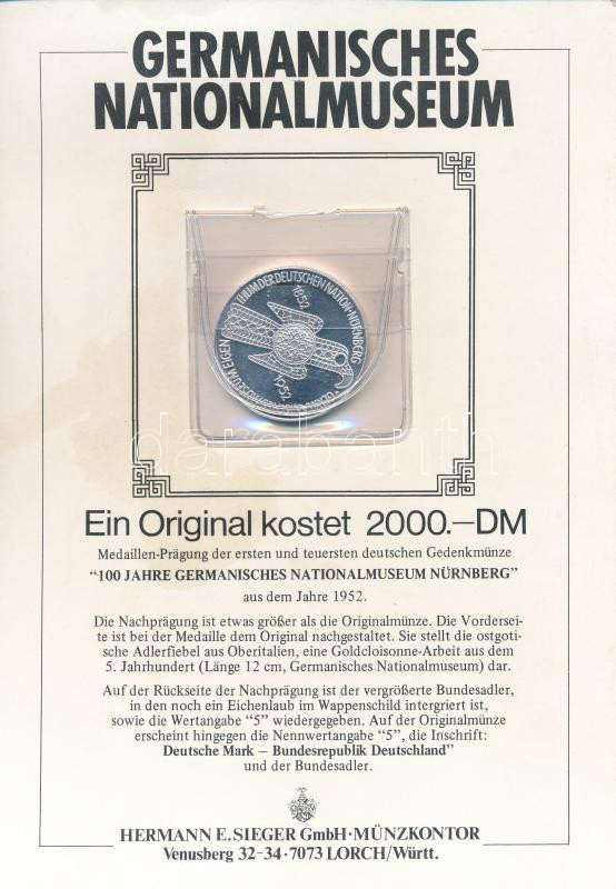 Németország ~2000. "100 éves a Nürnbergi Múzeum" fém utánveret német nyelvű leírással T:PP ujjlenyomat, kis karc Germany ~2000. "100th Anniversary of the Germanisches Museum of Nürnberg" metal restrike with a prospectus in german C:PP fingerprints, small scratch